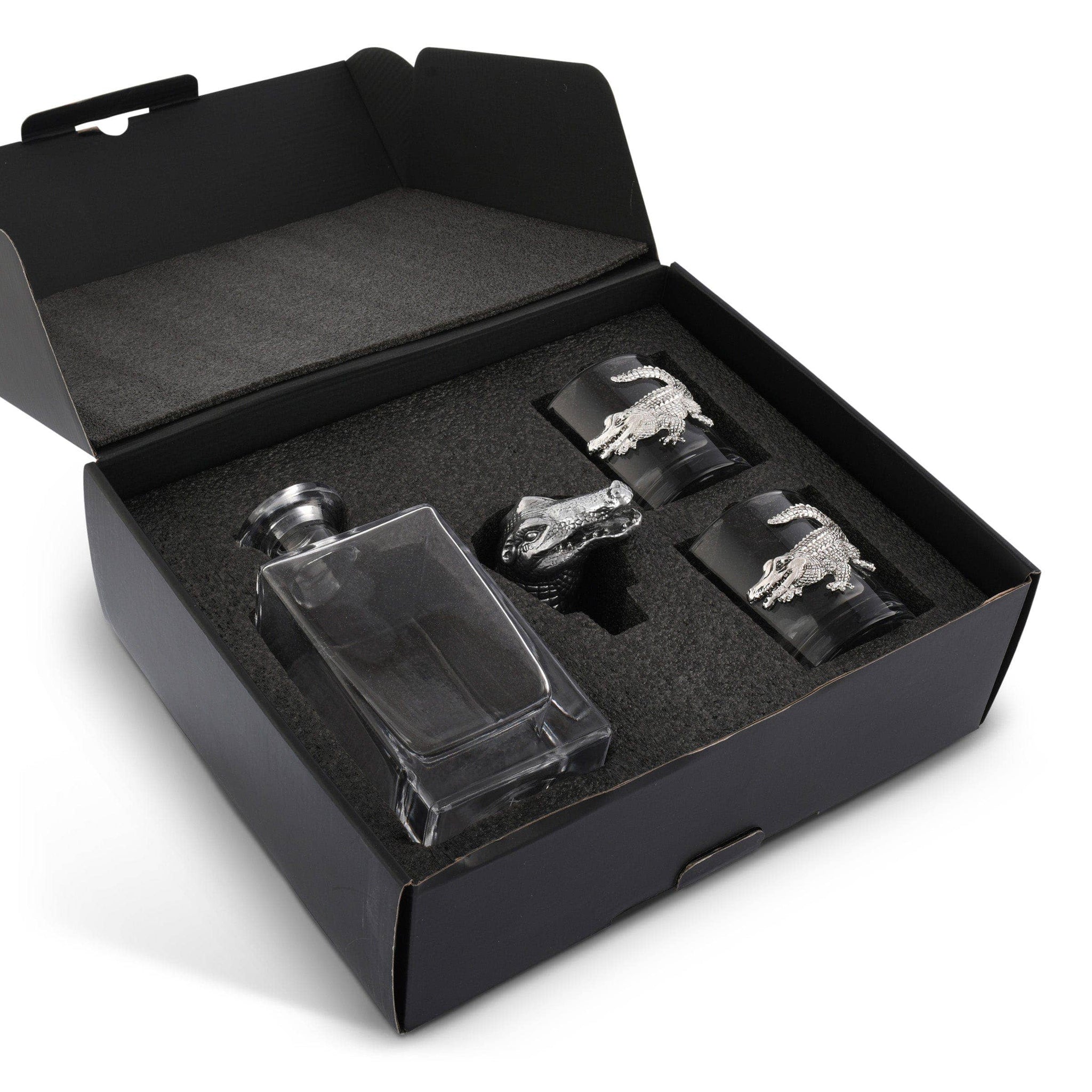 This set, featuring a 750ml decanter and a pair of glasses adorned with alligator motifs, is a perfect fusion of wild allure and refined sophistication. Ideal for groomsmen gifts, wedding presents, or as an exotic highlight in your bar or man cave décor, this set resonates with the spirit of both the alligator and its crocodilian cousin, the crocodile.