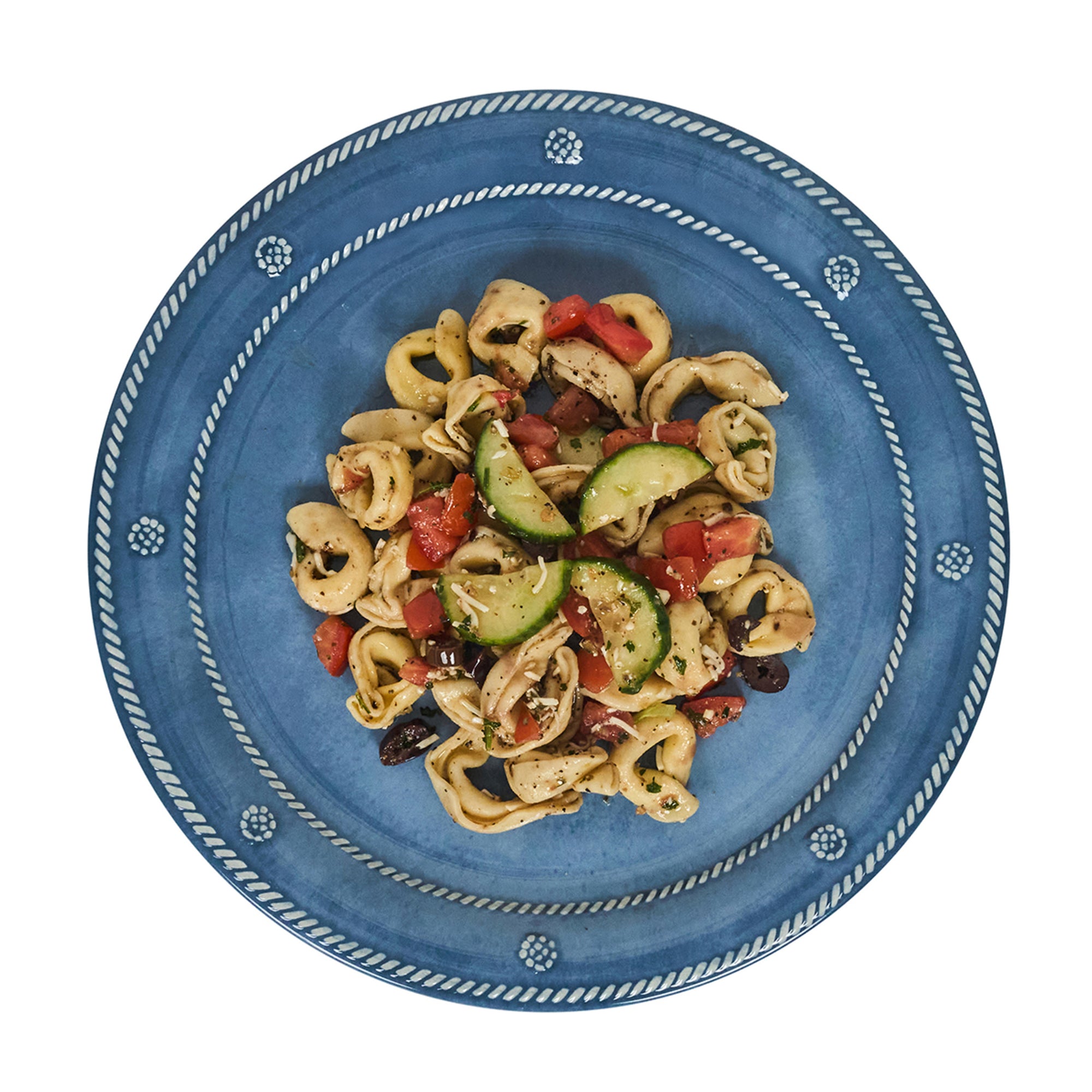 Juliska Berry & Thread Melamine Dinner Plate in ocean with pasta salad