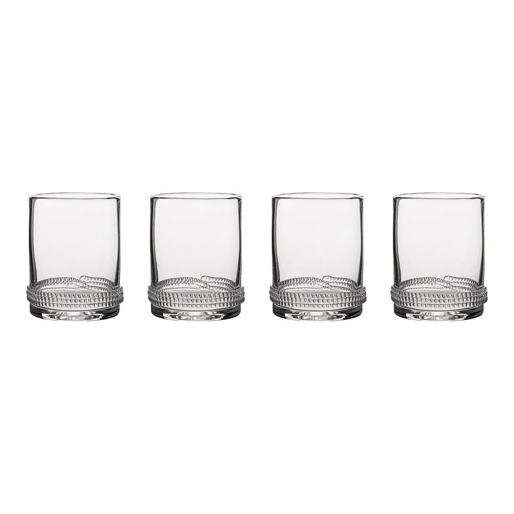 The classic. Four Double Old Fashioned glasses of unrivaled beauty for sipping and savoring the good life. Distinctive for its mix of spiral optic glass and hammered treatment, a ground-breaking technique achieved by Juliska's master glass artisans to stunning effect that pairs perfectly with smooth pours, favorite libations, and celebratory moments. Achieve legendary status by showing up with this set, which comes beautifully wrapped in the signature Juliska gift box. Let cocktail hour commence!