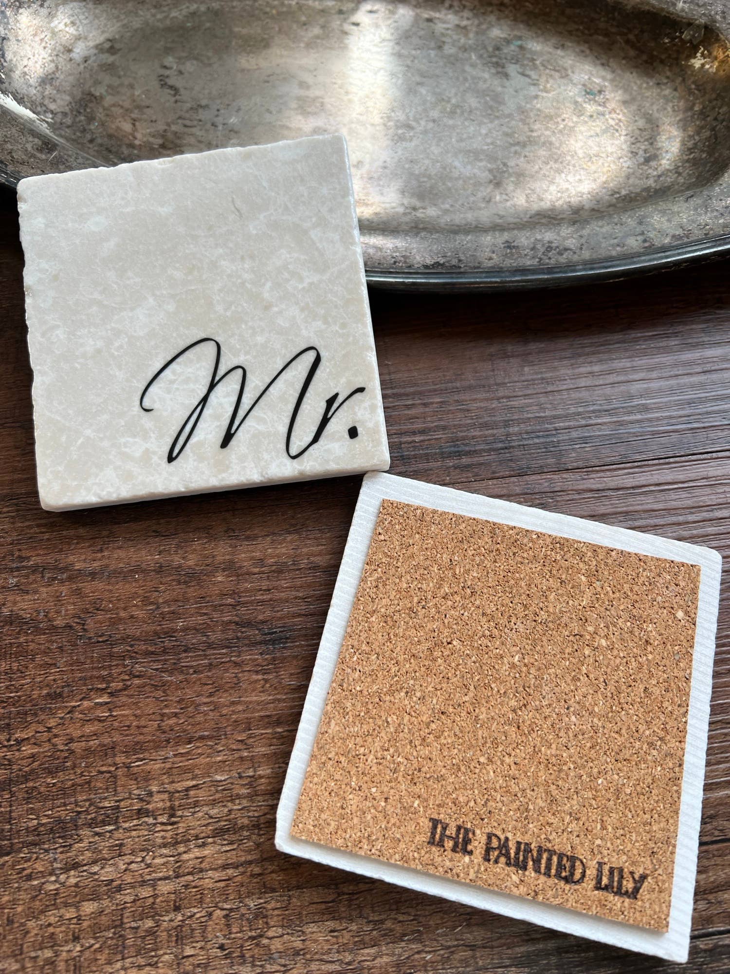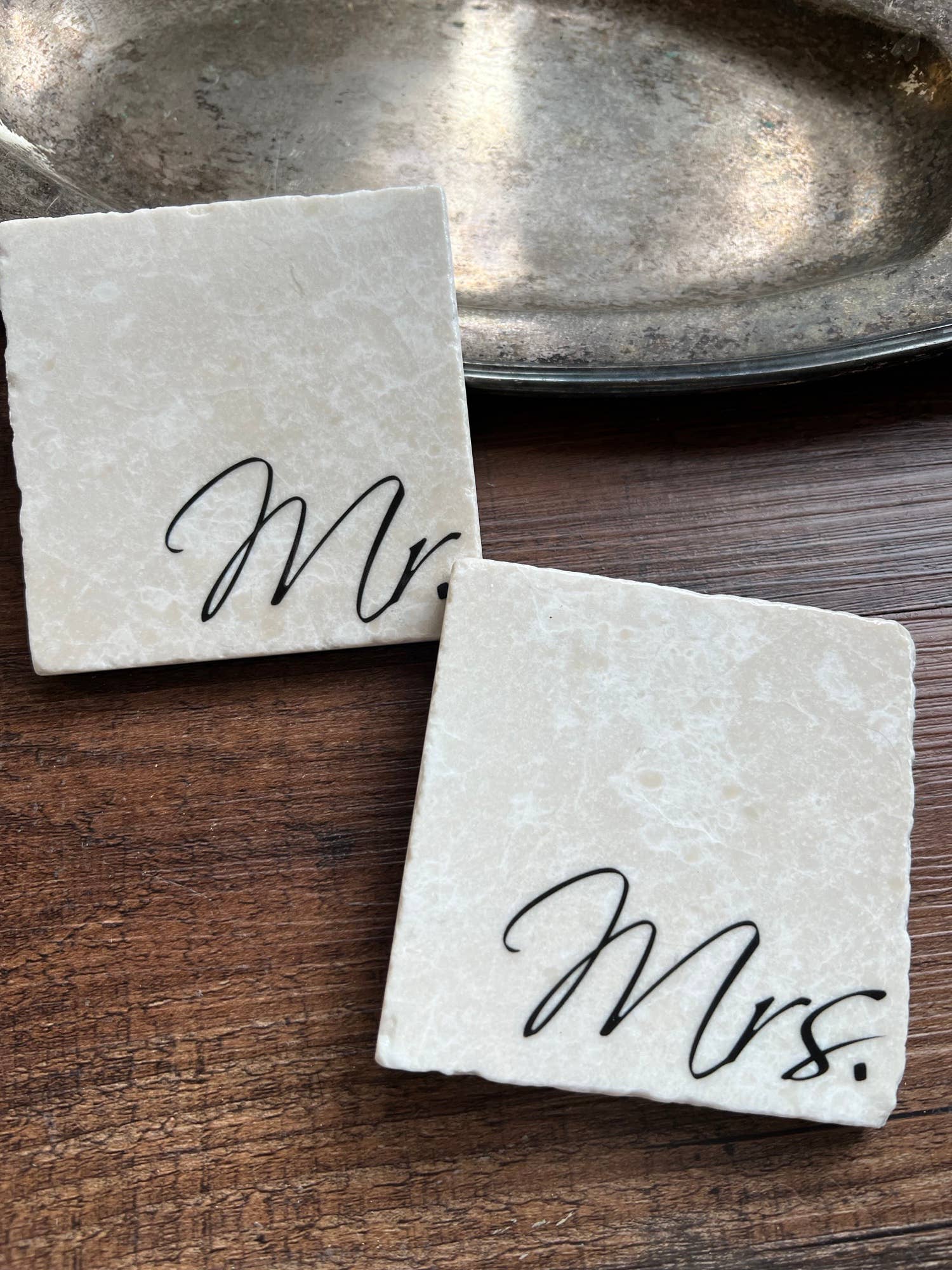 These Mr & Mrs stone coasters are made using tumbled marble tile and make the perfect wedding or engagement gift! Made to last a lifetime, our coasters are incredibly durable and good for use with hot and cold beverages. Like tiny works of art, our pieces are useful and beautiful!