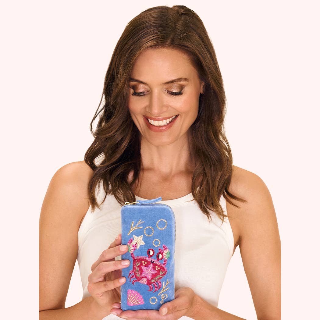 Dive into vibrant colours and playful embroidery! Our detailed seafaring crab dances around this luxurious velvet embroidered sunglasses pouch, sure to brighten your everyday. Carry down to evening drinks or keep in your hand luggage so your sunglasses always feel luxurious!