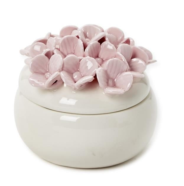Adorn your vanity or bedside table with the charming Hydrangea Trinket Jewelry Box. Crafted from delicate porcelain, this exquisite box is available in pink or blue, adding a touch of elegance to any space. Hydrangea blooms adorn the lid, creating a whimsical and feminine look. Perfect for stowing away your favorite pieces of jewelry or trinkets, this box is as functional as it is beautiful.
