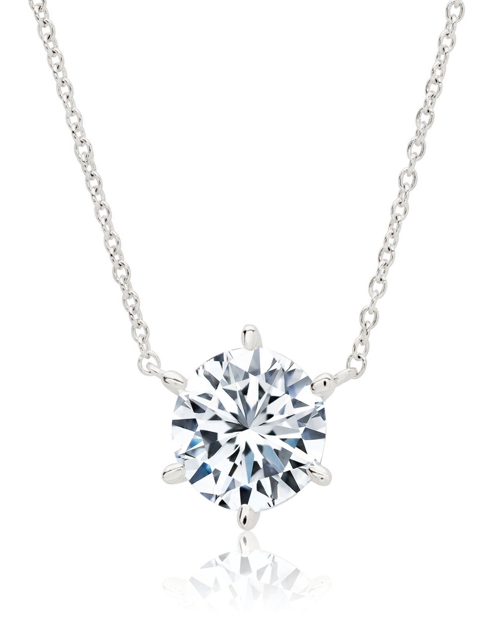 This classic pendant necklace features a solitaire 6 prong cubic zirconia, for a total carat weight of 2.0. This necklace is crafted in .925 sterling silver finished in pure platinum, with flawless handset cubic zirconia, on a chain that extends from 16" to 17" and 18". CRISLU jewelry is 100% hypoallergenic.