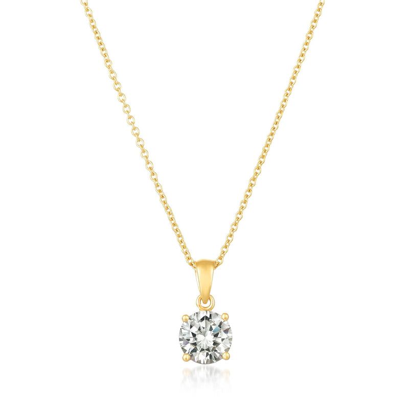 This solitaire pendant necklace features a 7.62mm brilliant cut cubic zirconia, for a total weight of 1.60 carats. This necklace is crafted in .925 sterling silver finished in 18kt yellow gold, with flawless handset cubic zirconia. The chain extends from 16" to 17” and 18", designed to be comfortable and easy to wear. CRISLU jewelry is 100% hypoallergenic.
