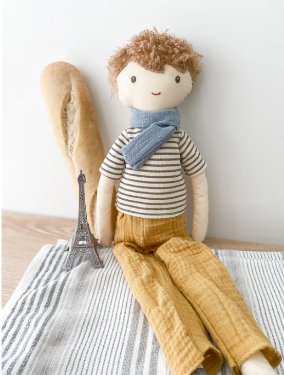 Bon Jour Henri! Say hello to Mon Ami's newest friend. Henri is dressed in traditional striped jersey and trendy mustard dungarees and is ready to travel into your world of imagination!