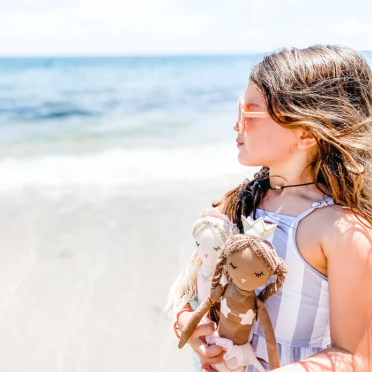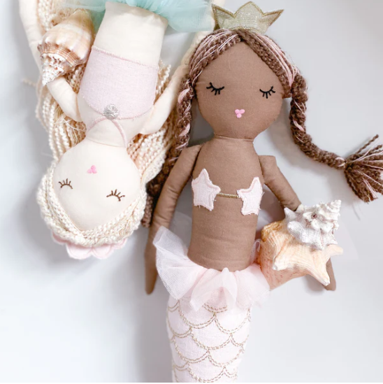 Macie the magical mermaid doll has popped up from the ocean to make some human friends! Her beautifully embroidered golden scales shimmer in the sun, while her sparkle crown adorns her head of yarn hair. This mermaid doll also bends at the waist so she is able to sit...perfect for pretend play or shelf decor.