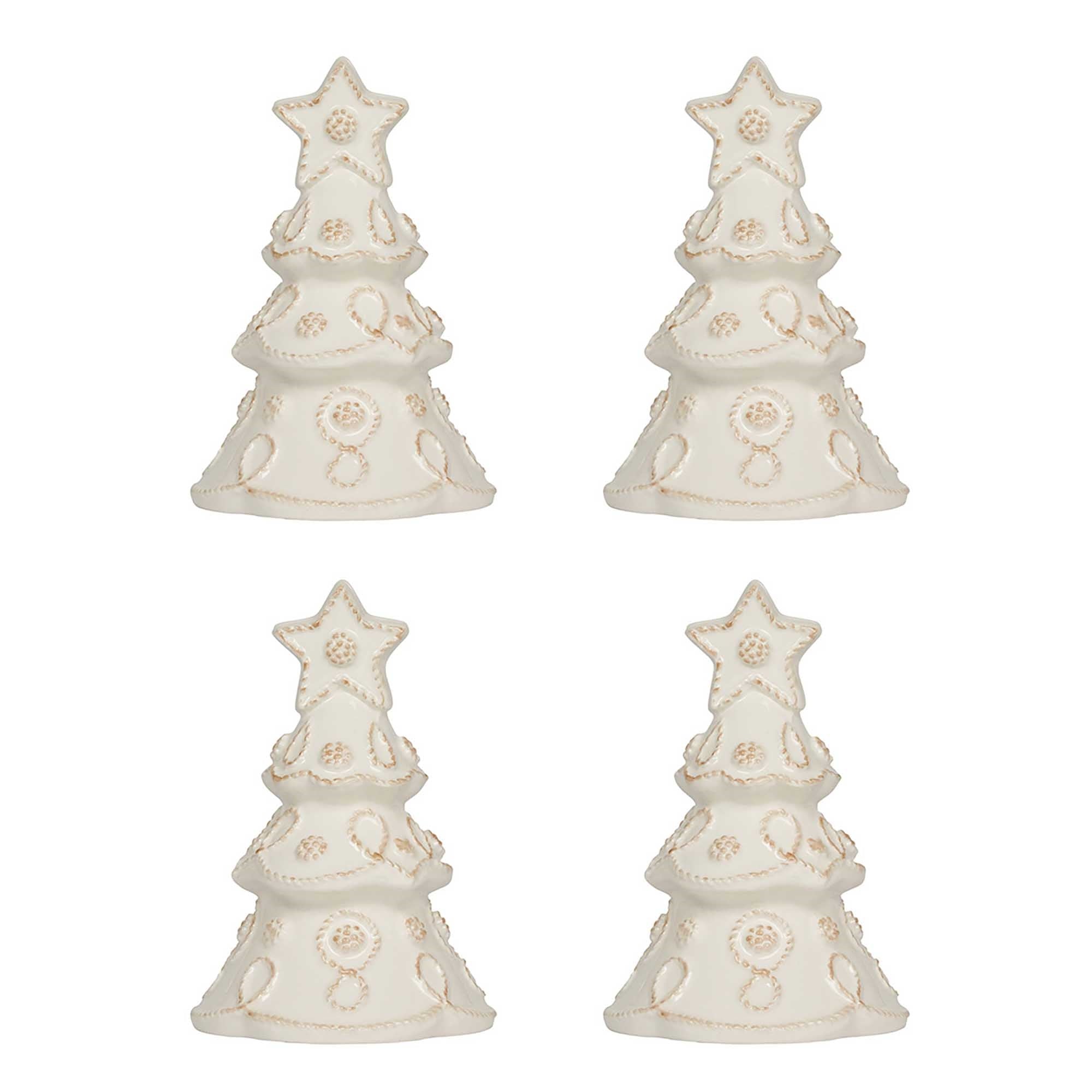 Oh, Tannenbaum! Spruce up winter tablescapes with these beautifully sculpted place card holders that are subtly festooned with Juliska's Berry & Thread motif in whitewash and trimmed with gold accents. Each glistening tree in this set of 4 is topped with a star and slotted at the top to hold one card—the perfect finishing touch for casual to formal table settings alike. Festively presented in a signature gift box (just add a bow!)