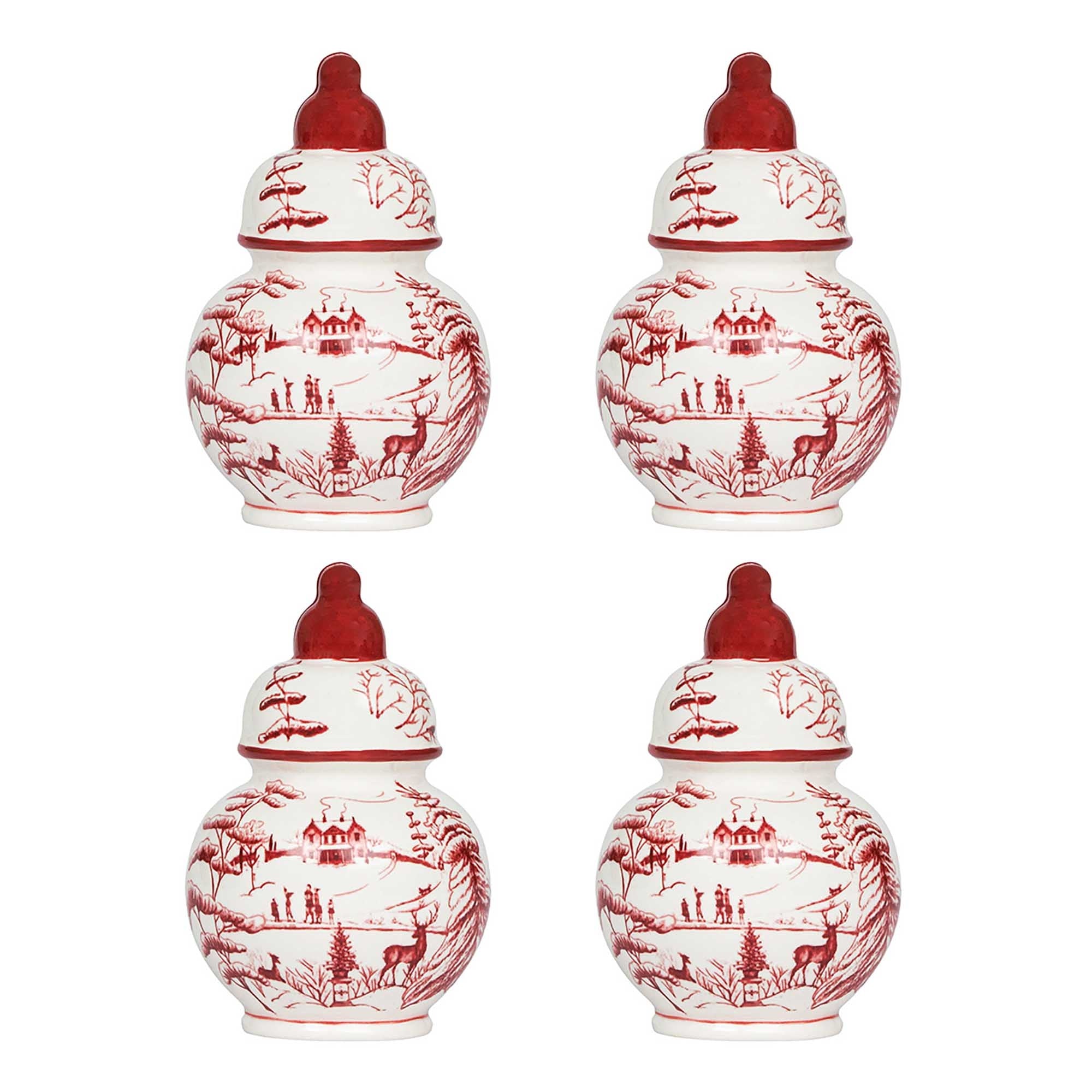 Exquisite little ginger jars with illustrated wintery scenes from Juliska's Country Estate in ruby red make this set of place card holders equally traditional, festive and charming. Each piece is slotted at the top to hold one card—the perfect finishing touch for casual or formal table settings alike. Festively presented in a signature gift box (just add a bow!)