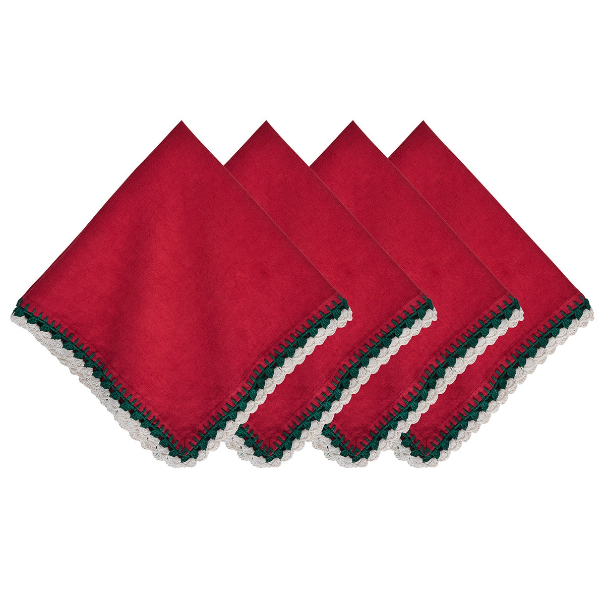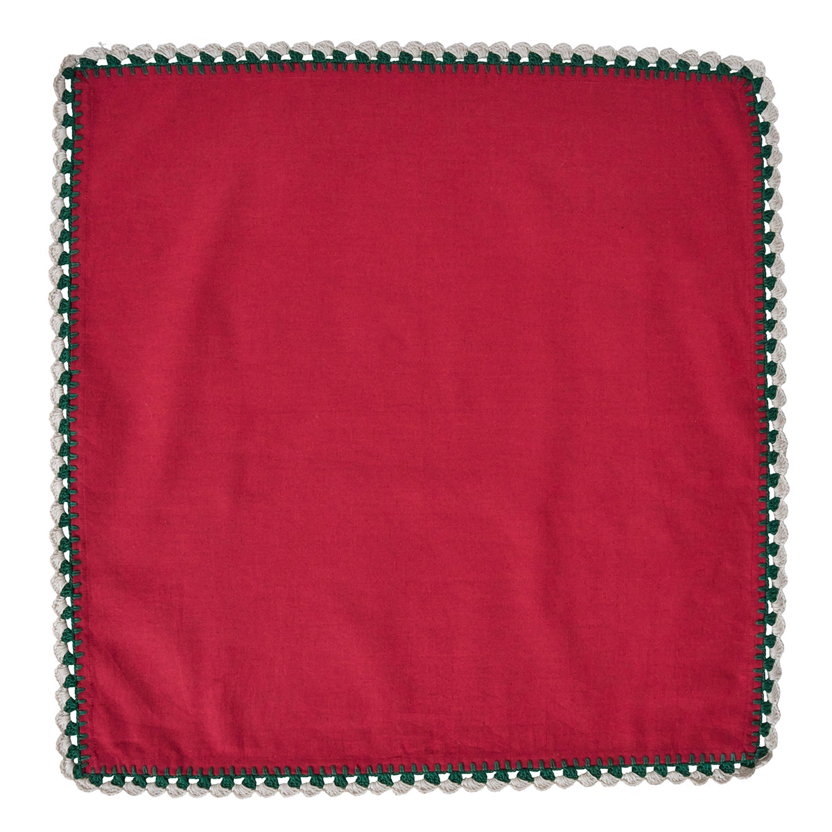 Complete your holiday table settings with this classic crimson napkin that’s trimmed with an evergreen crochet and a cream lace ruffle—as if handmade by Mrs. Claus herself.
