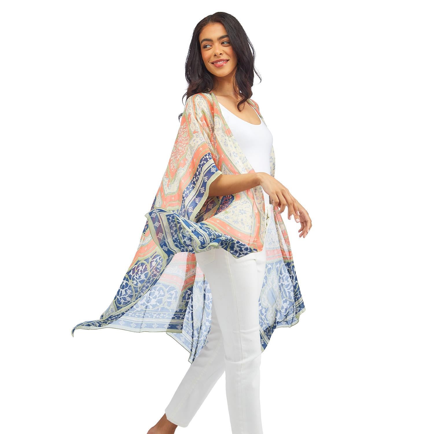 One Hundred Stars popular kimonos are made of a custom blend of modal and viscose which creates a silky smooth lightweight material while having a more sustainable impact on the environment. This long kimono jacket complete with wide 3/4 length sleeves can be worn for any occasion, whether you pair it with a neutral cami or layer it over a little black dress, it can make the perfect addition to your outfit. Kimonos come in one generous size but have been made to look flattering on all body shapes.