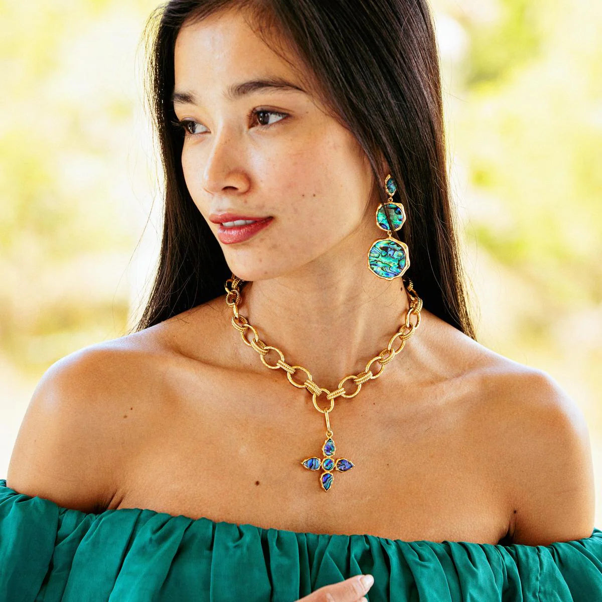 Inspired by the dancing northern lights and dripping in a trifecta of opulence - elemental, striking and vibrant - these statement earrings add a splash of drama to any outfit, day or night. Featuring sustainably harvested abalone set in a molten flourish of gleaming gold, this pair whispers of the mysterious treasures of Mother Earth - from the depths of the sea to the dancing northern lights in the sky -and serves as a reminder of the mercurial magic that you carry within you every day.