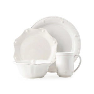 Rimmed with our simple thread and adorned with a sprinkling of berries, Juliska new 4 piece place setting in Whitewash contains a round dinner plate, scalloped dessert/salad plate, cereal/ice cream bowl and mug.