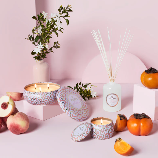 Voluspa's unique coconut wax blend is hand-poured into a 12 oz. metal vessel adorned in Maison pattern and topped with a matching lid that keeps the candle dust-free when not in use. Our three wicks allow you to enjoy fragrance ample fragrance throw for 40 hours. Our candles are hand-poured in the United States and feature our proprietary, clean-burning coconut wax blend and 100% natural wicks. Our products are free of phthalates, pesticides, parabens and sulfates and are never tested on animals. Up-cycle this best seller into a keepsake after the last burn.